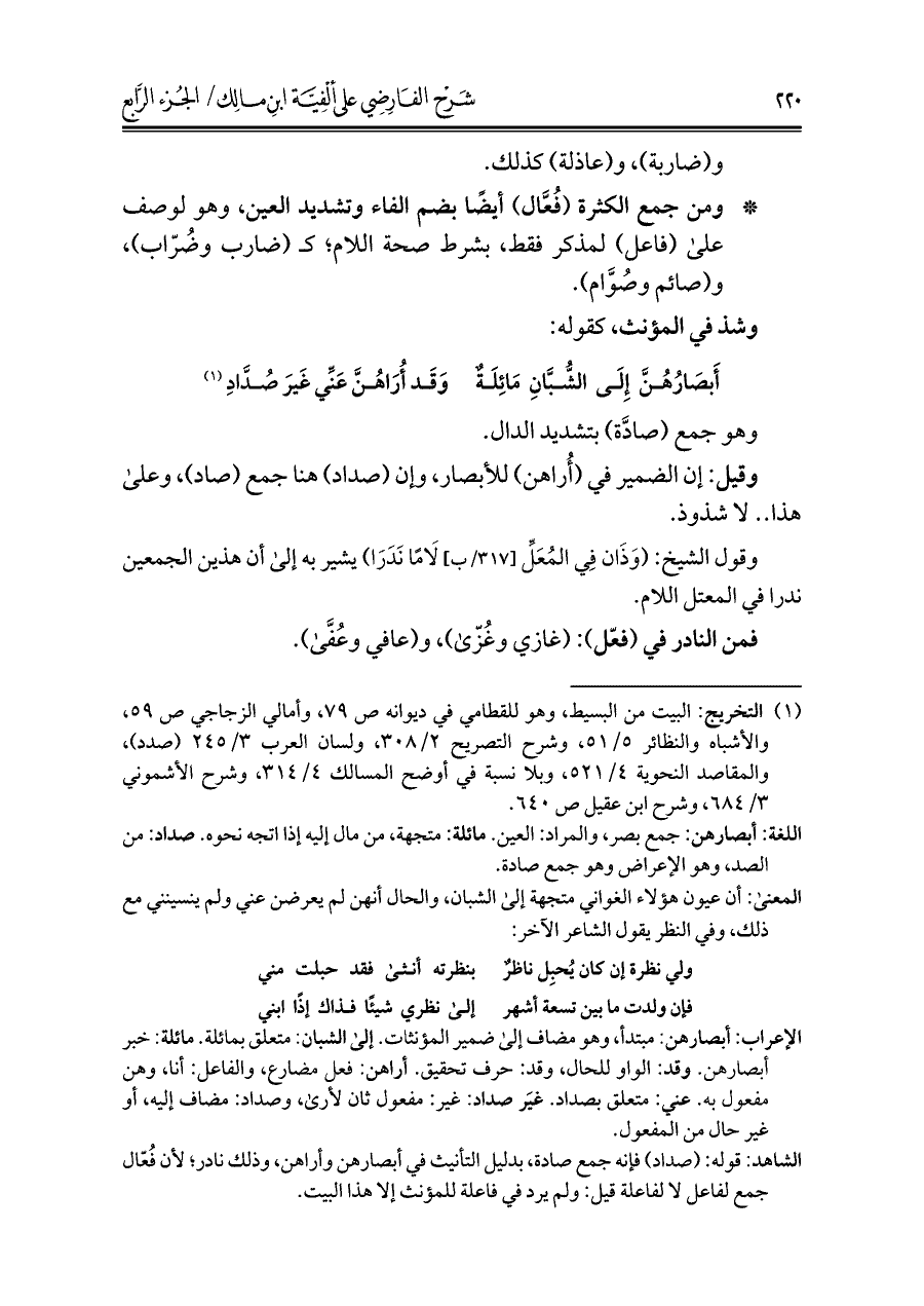 الشاهد: قوله: (صداد) فإنه جمع صادة، بدليل التأنيث في أبصارهن وأراهن، وذلك نادر؛ لأن فُعّال جمع لفاعل لا لفاعلة قيل: ولم يرد في فاعلة للمؤنث إلا هذا البيت.
