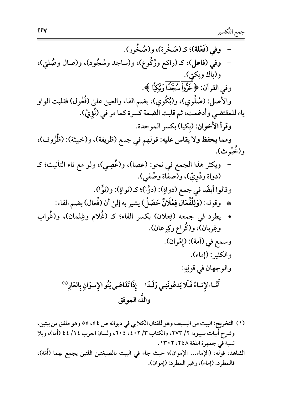 - ويكثر هذا الجمع في نحو: (عصا)، و (عُصِي)، ولو مع تاء التأنيث؛ كـ (دواة ودُوِيّ)، و (صفاة وصُفي).