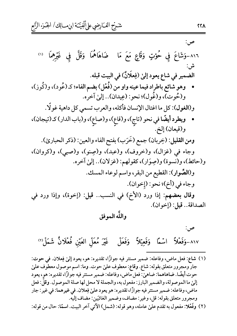 (¬١) شاع: فعل ماض، وفاعله: ضمير مستتر فيه جوازًا، تقديره: هو، يعود إلى فِعلان. في حوت: جار ومجرور متعلق بقوله: شاع. وقاع: معطوف على حوت. وما: اسم موصول معطوف على حوت أيضًا. ضاهاهما: ضاهى: فعل ماض، وفاعله: ضمير مستتر فيه جوازًا، تقديره: هو، يعود إلى ما الموصولة، والضمير البارز: مفعول به، والجملة لا محل لها صلة الموصول. وقلَّ: فعل ماض، وفاعله: ضمير مستتر فيه جوازًا، تقديره: هو يعود على فِعلان. في غيرهما: في غير: جار ومجرور متعلق بقوله: قل، وغير: مضاف، وضمير الغائبَين: مضاف إليه.