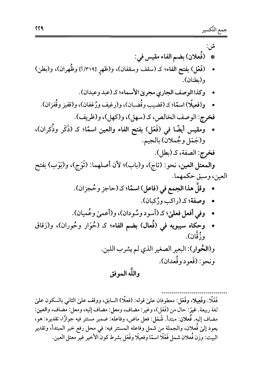 = فَعْلًا. وفَعِيلا, وفَعَل: معطوفان على قوله: (فعلًا) السابق، ووقف على الثاني بالسكون على لغة ربيعة. غيرَ: حال من (فَعَل)، وغير: مضاف، ومعل: مضاف إليه، ومعل: مضاف، والعين: مضاف إليه. فُعلان: مبتدأ. شَمَل: فعل ماض، وفاعله: ضمير مستتر فيه جوازًا، تقديره: هو، يعود إلى فُعلان، والجملة من شمل وفاعله المستتر فيه: في محل رفع خبر المبتدأ، وتقدير البيت: وزن فُعلان شمل فَعْلًا اسمًا وفعيلَا وفَعَل بشرط كون الأخير غير معتل العين.