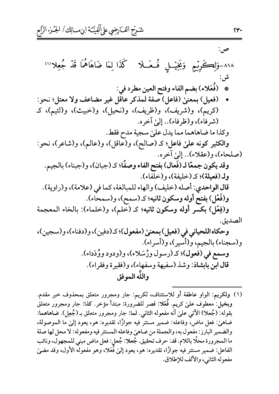 ٨١٨ - وَلِكَرِيْمٍ وَبَخِيْلٍ فُعَلَا ... كَذَا لِمَا ضَاهَاهُمَا قَدْ جُعِلا (¬١)
