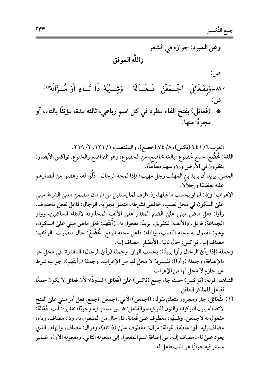 الشاهد: قوله: (نواكس) حيث جاء جمع (ناكس) على (فَعَائل) شذوذًا؛ لأن فعائل لا يكون جمعًا لفاعل للمذكر العاقل.