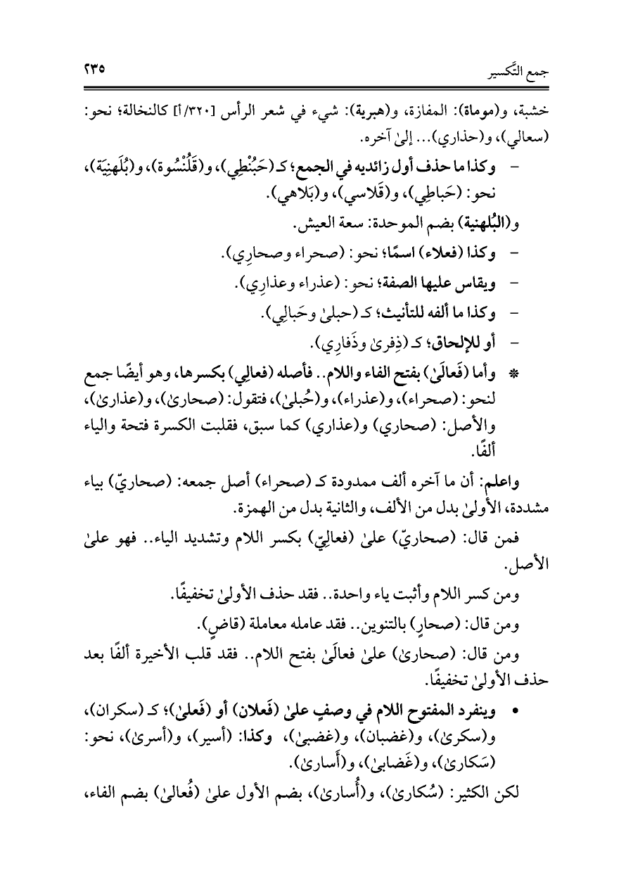 ومن قال: (صحارى) على فعالَى بفتح اللام. . فقد قلب الأخيرة ألفًا بعد حذف الأولى تخفيفًا.