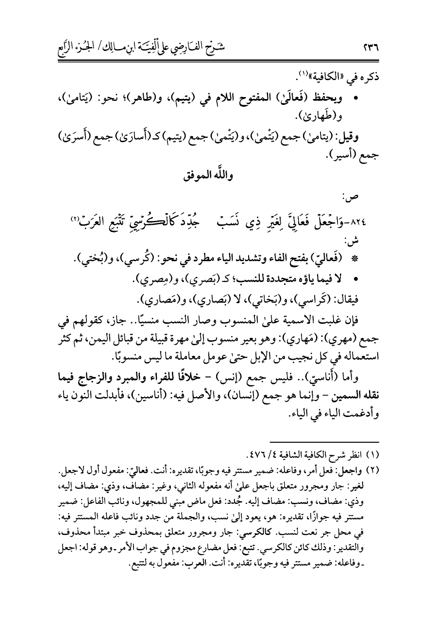 ٨٢٤ - وَاجْعَلْ فَعَالِيَّ لِغَيْرِ ذِي نَسَبْ ... جُدِّدَ كَالْكُرْسِيِّ تَتْبَعِ العَرَبْ (¬٢)