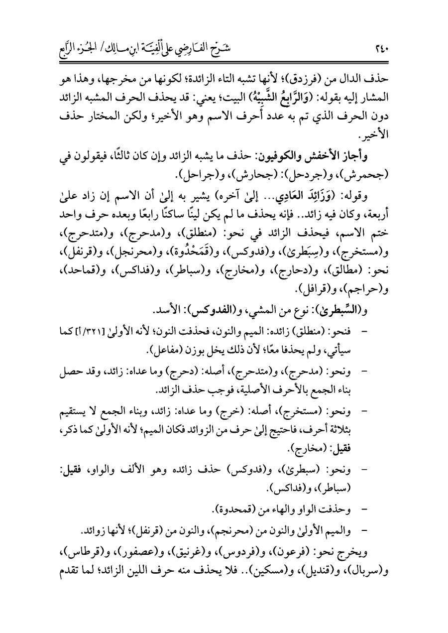 وقوله: (وَزَائِدَ العَادِي. . . إلى آخره) يشير به إلى أن الاسم إن زاد على أربعة، وكان فيه زائد. . فإنه يحذف ما لم يكن لينًا ساكنًا رابعًا وبعده حرف واحد ختم الاسم، فيحذف الزائد في نحو: (منطلق)، و (مدحرج)، و (متدحرج)، و (مستخرج)، و (سِبَطرى)، و (فدوكس)، و (قَمَحْدُوة)، و (محرنجل)، و (قرنفل)، نحو: (مطالق)، و (دحارج)، و (مخارج)، و (سباطر)، و (فداكس)، و (قماحد)، و (حراجم)، و (قرافل).