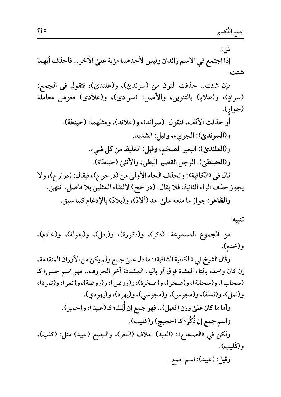 فإن شئت. . حذفت النون من (سرندى)، و (علندى)، فتقول في الجمع: (سرادٍ)، و (علادٍ) بالتنوين، والأصل: (سرادي)، و (علادي) فعومل معاملة (جوارٍ).
