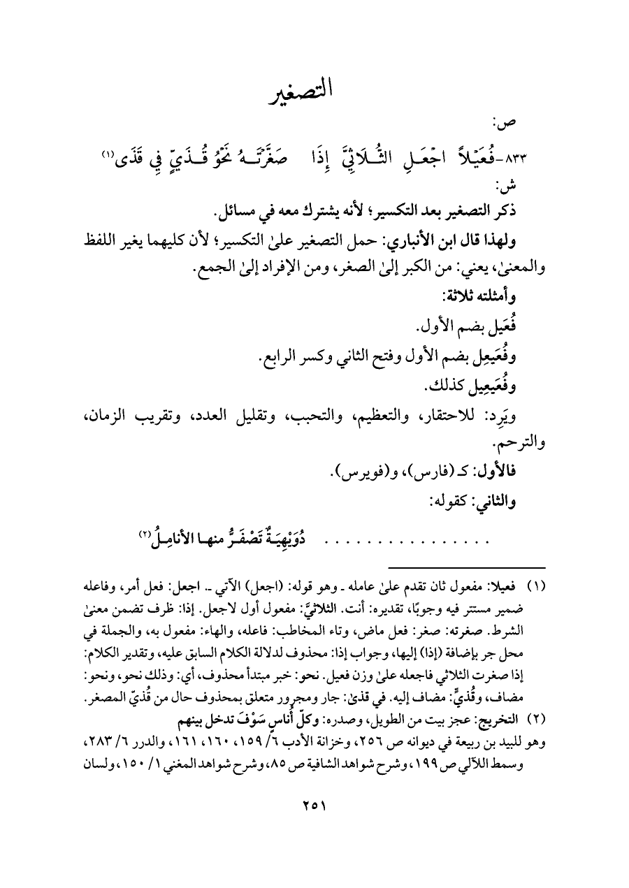 ٨٣٣ - فُعَيْلًا اجْعَلِ الثُّلَاثِيَّ إِذَا ... صَغَّرْتَهُ نَحْوُ قُذَيٍّ فِي قَذَى (¬١)
