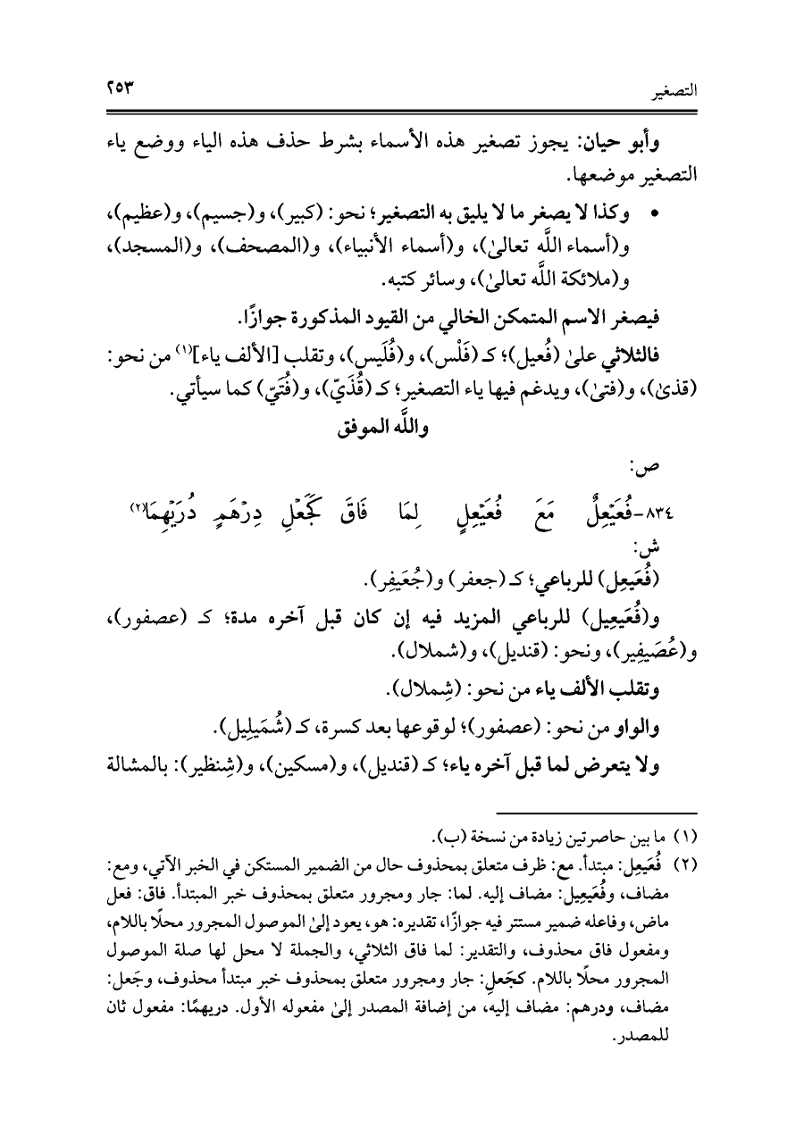 ٨٣٤ - فُعَيْعِلٌ مَعَ فُعَيْعِلٍ لِمَا ... فَاقَ كَجَعْلِ دِرْهَمٍ دُرَيْهِمَا (¬٢)