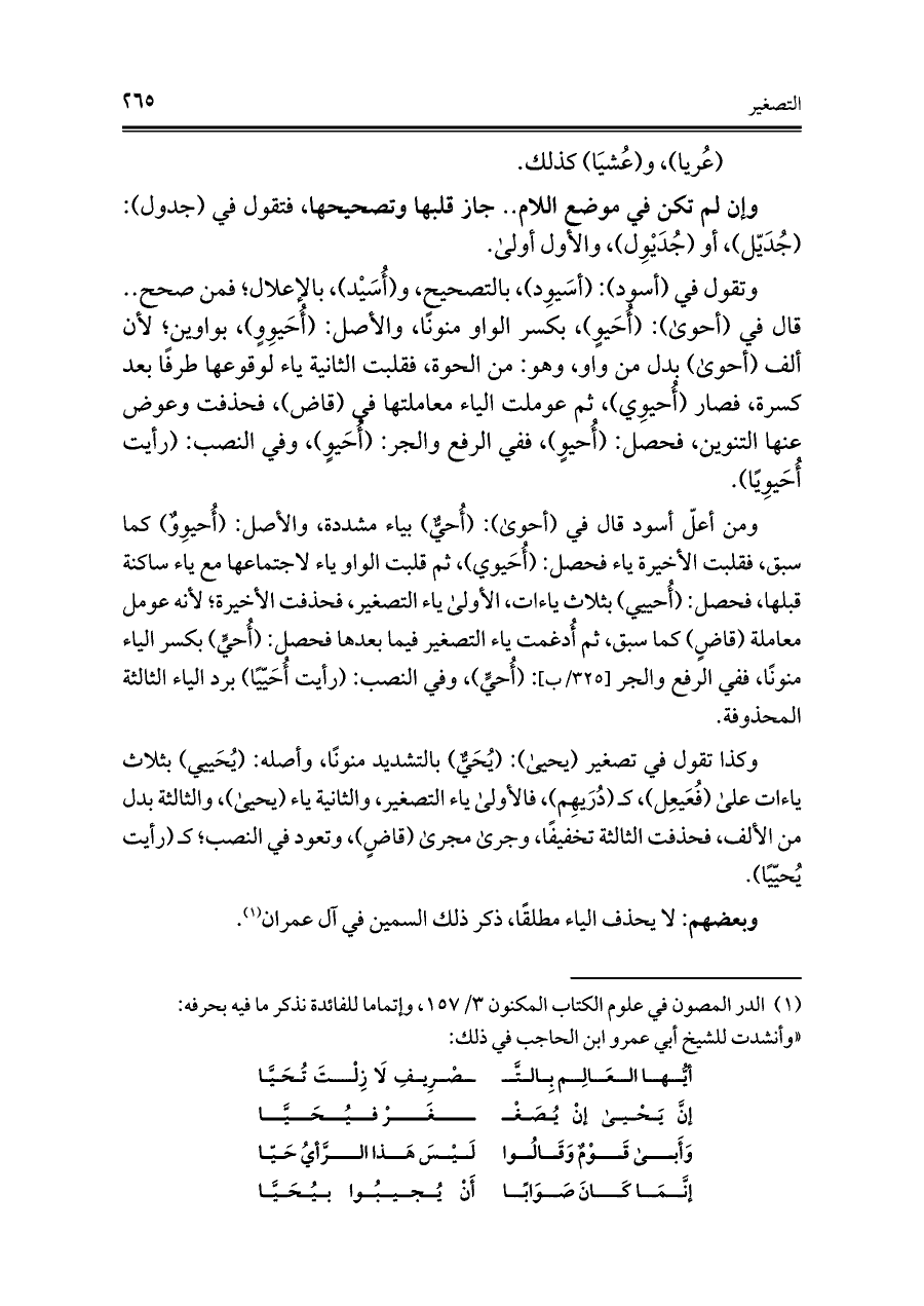 وكذا تقول فِي تصغير (يحيى): (يُحَيٌّ) بالتشديد منونًا، وأصله: (يُحَييي) بثلاث ياءات على (فُعَيعِل)، كـ (دُرَيهِم)، فالأولى ياء التصغير، والثانية ياء (يحيى)، والثالثة بدل من الألف، فحذفت الثالثة تخفيفًا، وجرى مجرى (قاضٍ)، وتعود فِي النصب؛ كـ (رأيت يُحيّيًا).