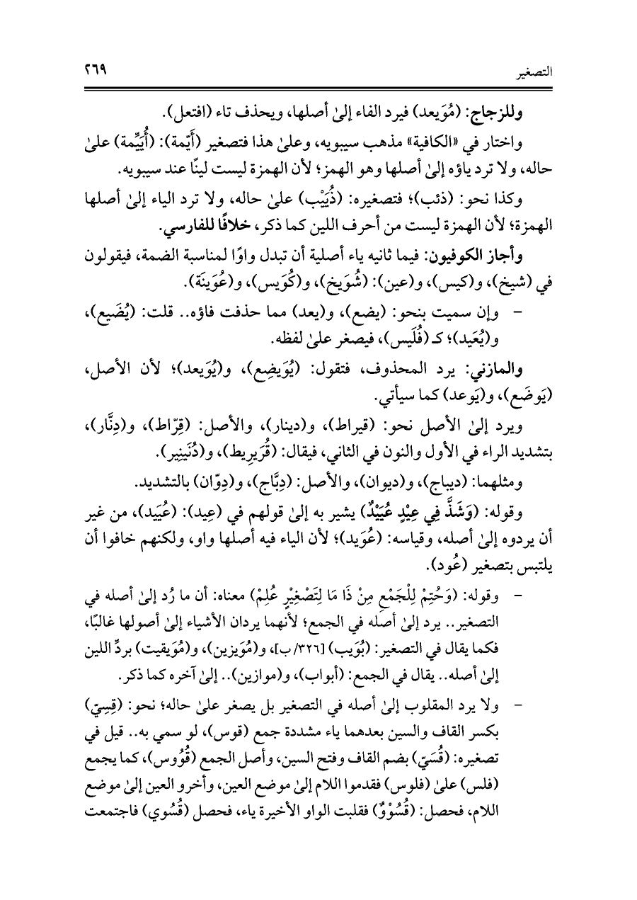 وأجاز الكوفيون: فيما ثانيه ياء أصلية أن تبدل واوًا لمناسبة الضمة، فيقولون فِي (شيخ)، و (كيس)، و (عين): (شُوَيخ)، و (كُوَيس)، و (عُوَينَة).