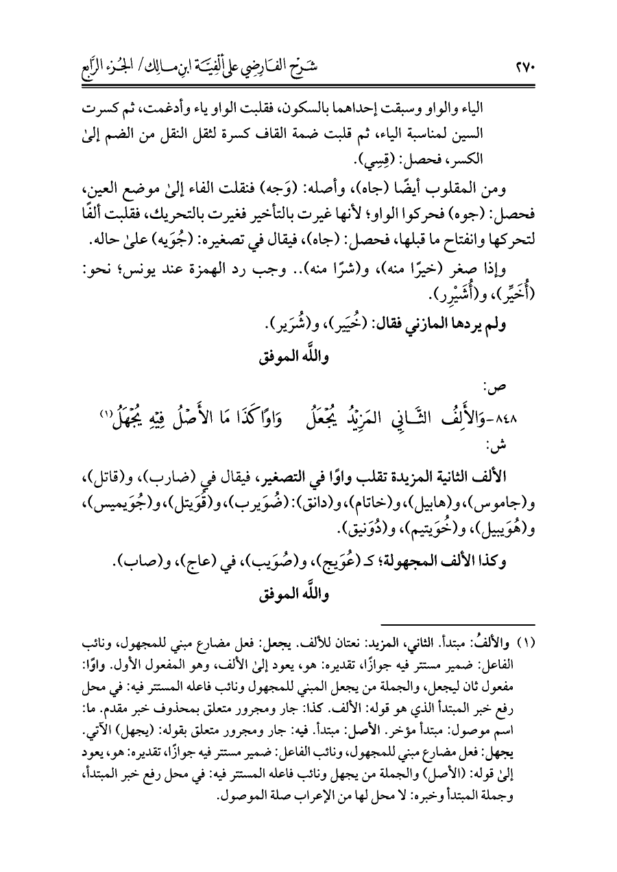 (¬١) والألفُ: مبتدأ. الثاني، المزيد: نعتان للألف. يجعل: فعل مضارع مبني للمجهول، ونائب الفاعل: ضمير مستتر فيه جوازًا، تقديره: هو، يعود إِلى الألف، وهو المفعول الأول. واوًا: مفعول ثان ليجعل، والجملة من يجعل المبني للمجهول ونائب فاعله المستتر فيه: فِي محل رفع خبر المبتدأ الذي هو قوله: الألف. كذا: جار ومجرور متعلق بمحذوف خبر مقدم. ما: اسم موصول: مبتدأ مؤخر. الأصل: مبتدأ. فيه: جار ومجرور متعلق بقوله: (يجهل) الآتي. يجهل: فعل مضارع مبني للمجهول، ونائب الفاعل: ضمير مستتر فيه جوازًا، تقديره: هو، يعود إِلى قوله: (الأصل) والجملة من يجهل ونائب فاعله المستتر فيه: فِي محل رفع خبر المبتدأ، وجملة المبتدأ وخبره: لا محل لها من الإِعراب صلة الموصول.