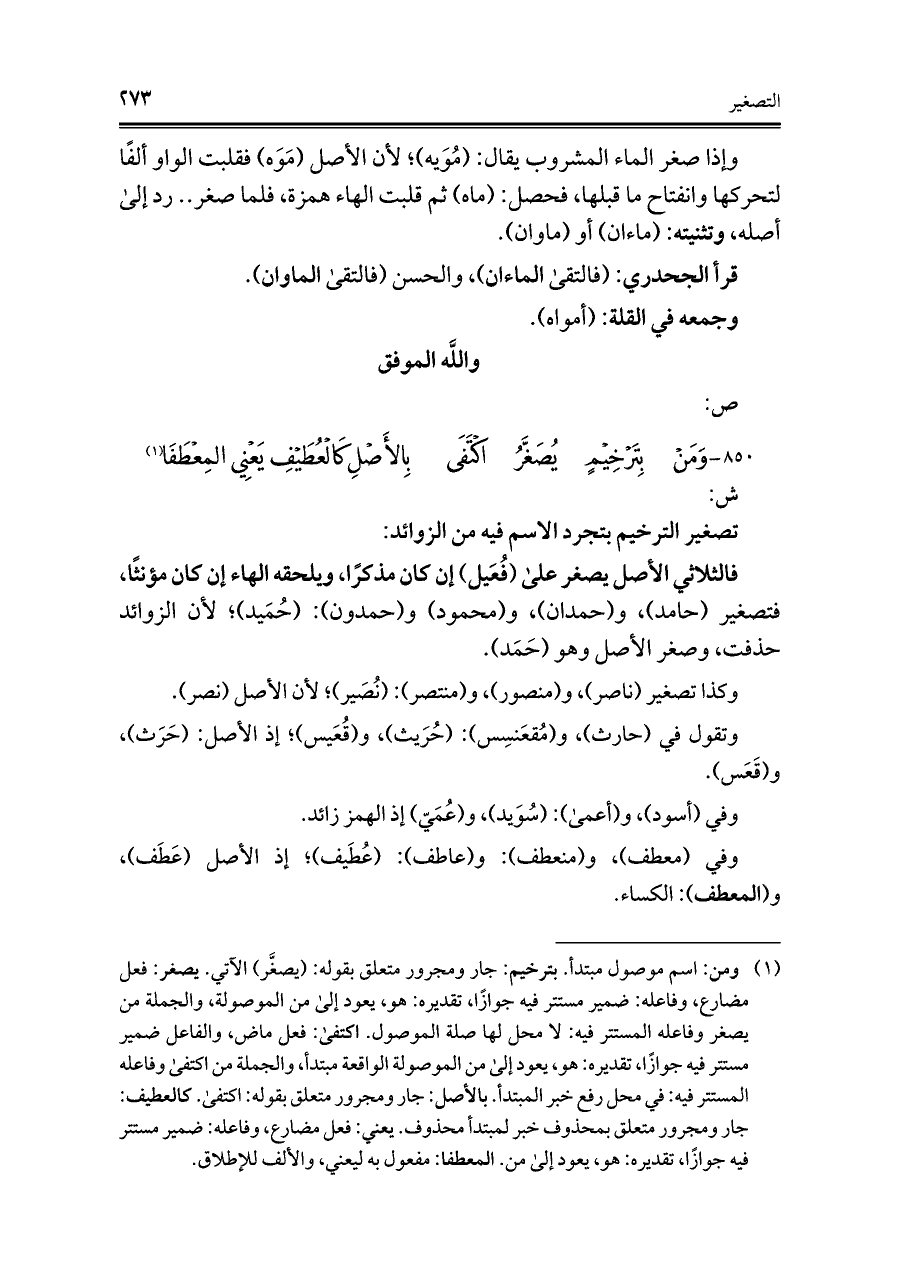 (¬١) ومن: اسم موصول مبتدأ. بترخيم: جار ومجرور متعلق بقوله: (يصغَّر) الآتي. يصغر: فعل مضارع، وفاعله: ضمير مستتر فيه جوازًا، تقديره: هو، يعود إِلى من الموصولة، والجملة من يصغر وفاعله المستتر فيه: لا محل لها صلة الموصول. اكتفى: فعل ماض، والفاعل ضمير مستتر فيه جوازًا، تقديره: هو، يعود إِلى من الموصولة الواقعة مبتدأ، والجملة من اكتفى وفاعله المستتر فيه: فِي محل رفع خبر المبتدأ. بالأصل: جار ومجرور متعلق بقوله: اكتفى. كالعطيف: جار ومجرور متعلق بمحذوف خبر لمبتدأ محذوف. يعني: فعل مضارع، وفاعله: ضمير مستتر فيه جوازًا، تقديره: هو، يعود إِلى من. المعطفا: مفعول به ليعني، والألف للإِطلاق.