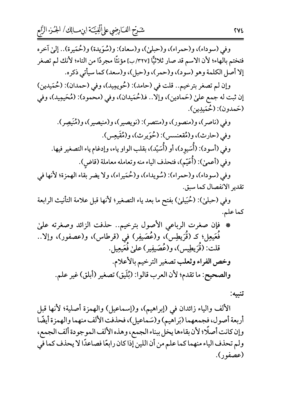 * فإِن صغرت الرباعي الأصول بترخيم. . حذفت الزائد وصغرته على فُعَيعِل؛ كـ (قُرَيطِس)، و (عُصَيفِر) فِي (قرطاس)، و (عصفور)، وإِلا. . قلت: (قُرَيطِيس)، و (عُصَيفِير) على فُعَيعِيل.