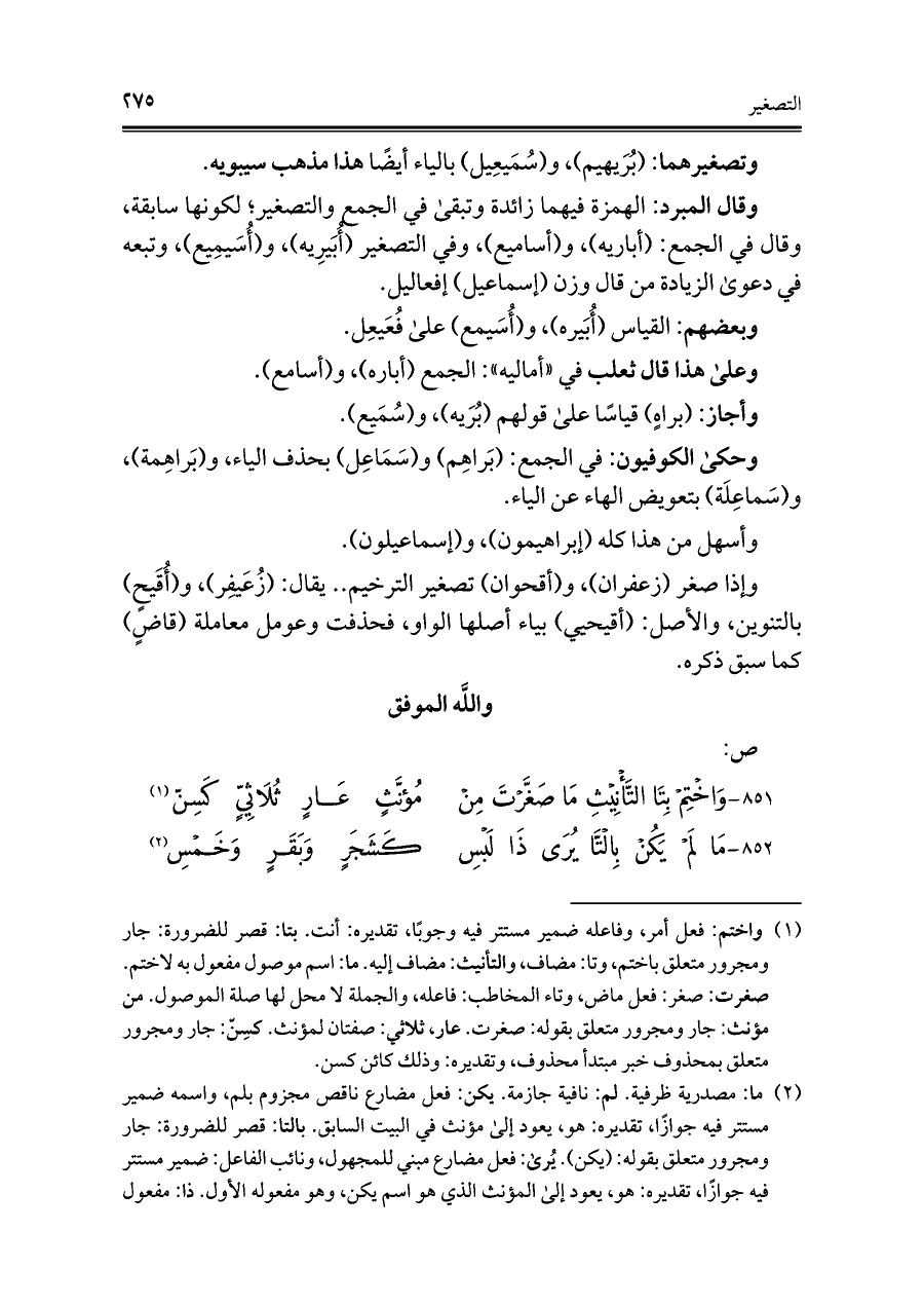 وتصغيرهما: (بُرَيهيم)، و (سُمَيعِيل) بالياء أيضًا هذا مذهب سيبويه.