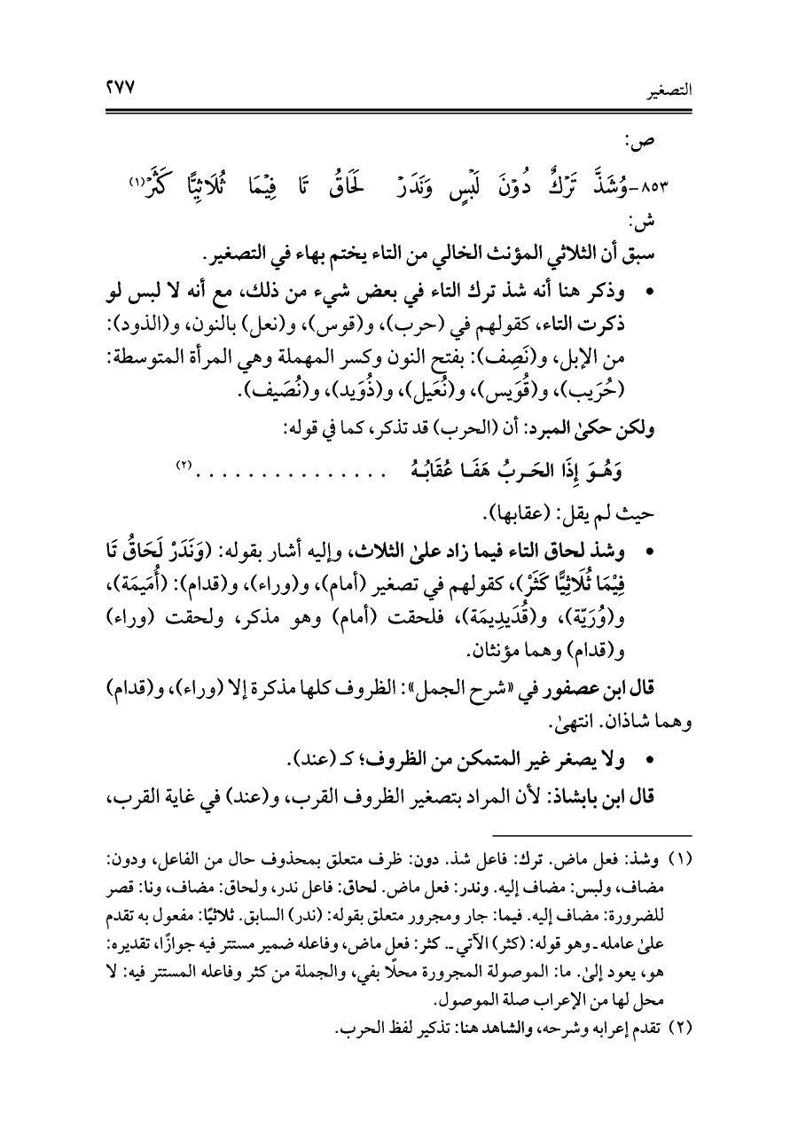 • وذكر هنا أنه شذ ترك التاء فِي بعض شيء من ذلك، مع أنه لا لبس لو ذكرت التاء، كقولهم في (حرب)، و (قوس)، و (نعل) بالنون، و (الذود): من الإِبل، و (نَصِف): بفتح النون وكسر المهملة وهي المرأة المتوسطة: (حُرَيب)، و (قُوَيس)، و (نُعَيل)، و (ذُوَيد)، و (نُصَيف).