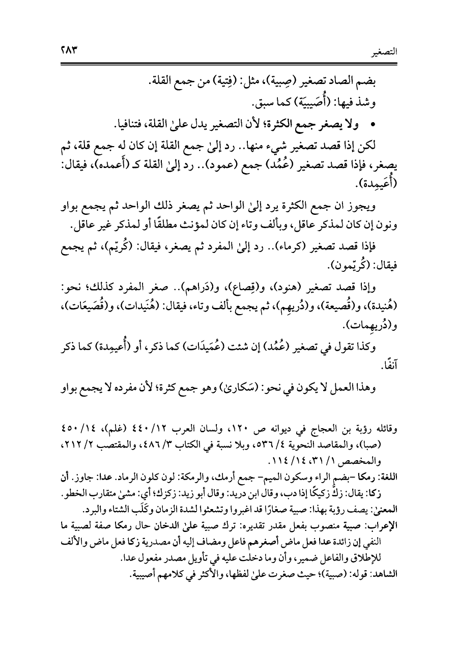 لكن إِذا قصد تصغير شيء منها. . رد إِلى جمع القلة إِن كان له جمع قلة، ثم يصغر، فإِذا قصد تصغير (عُمُد) جمع (عمود). . رد إِلى القلة كـ (أَعمده)، فيقال: (أُعَيمِدة).