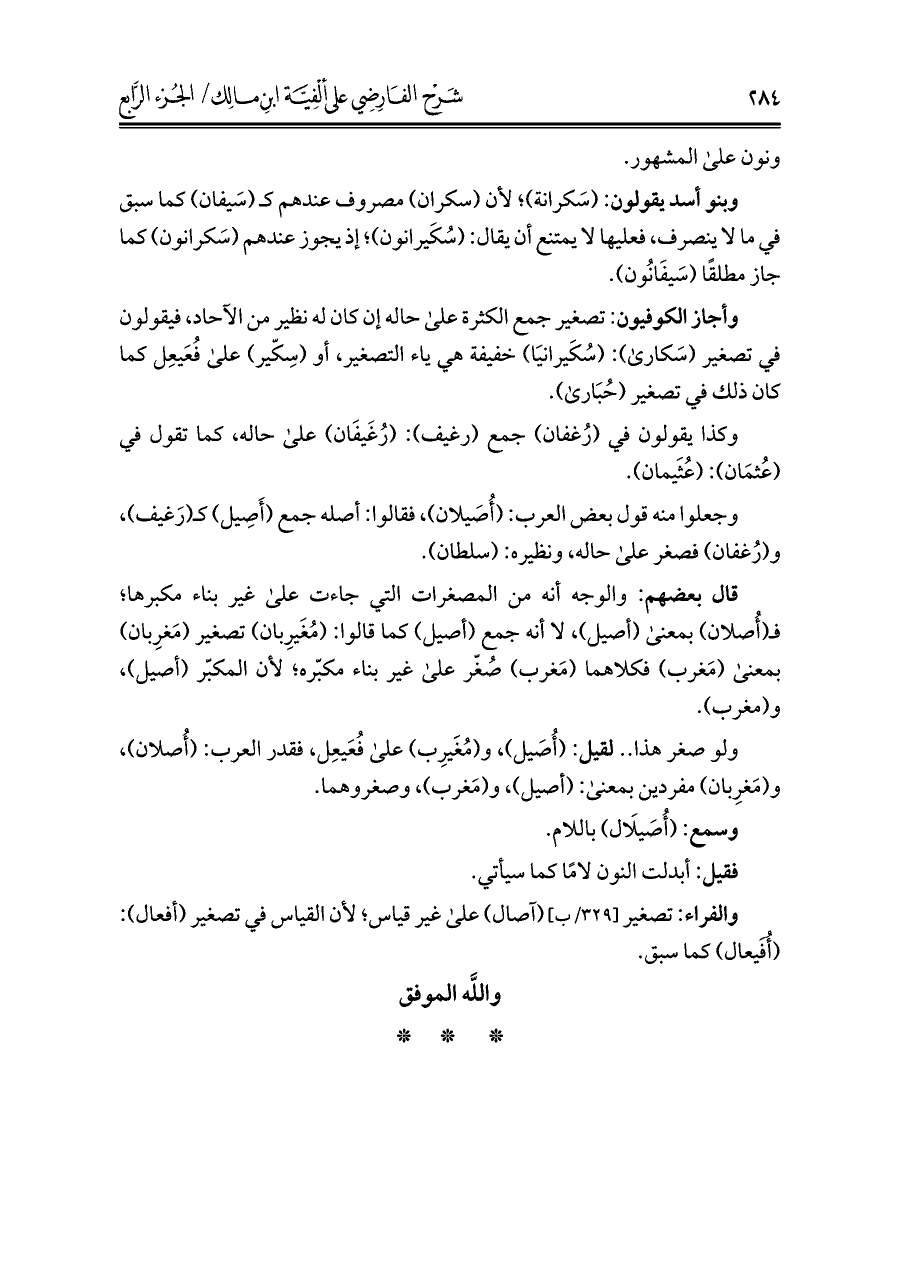 والفراء: تصغير (آصال) على غير قياس؛ لأن القياس فِي تصغير (أفعال): (أُفَيعال) كما سبق.