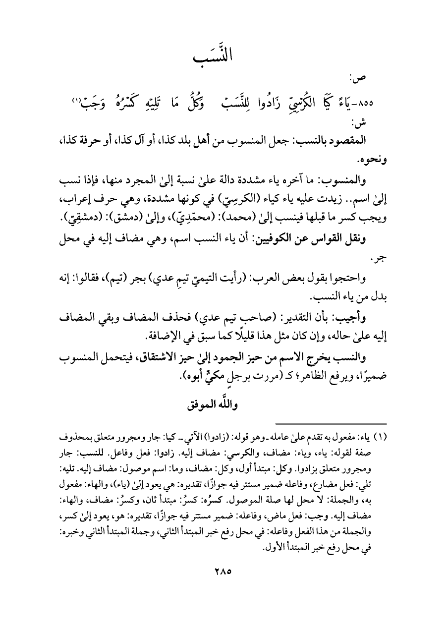 والمنسوب: ما آخره ياء مشددة دالة على نسبة إِلى المجرد منها، فإِذا نسب إِلى اسم. . زيدت عليه ياء كياء (الكرسِيّ) فِي كونها مشددة، وهي حرف إِعراب، ويجب كسر ما قبلها فينسب إِلى (محمد): (محمّدِيّ)، وإِلى (دمشق): (دمشقِيّ).