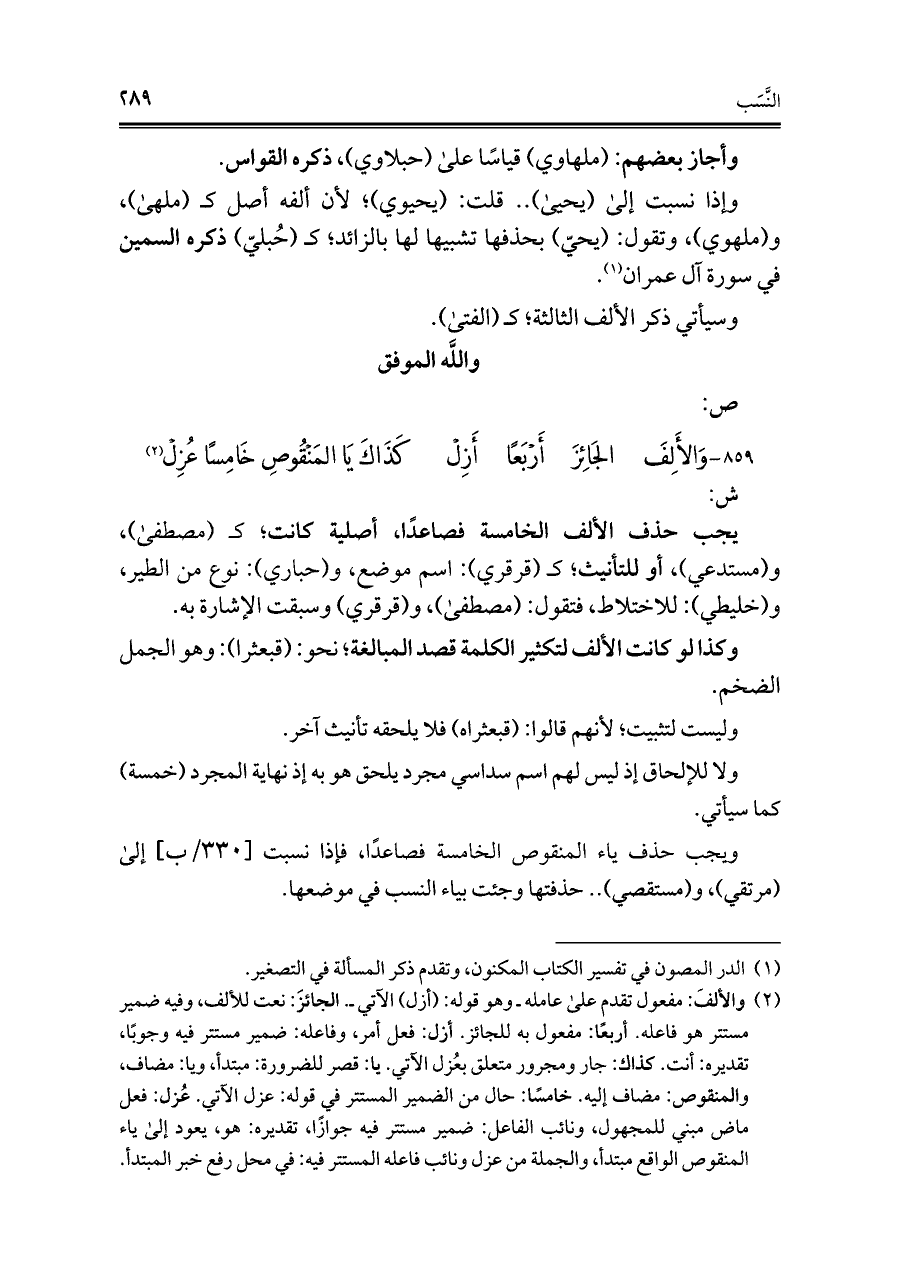 ٨٥٩ - وَالأَلِفَ الجَائِزَ أَرْبَعًا أَزِلْ ... كَذَاكَ يا المَنْقُوصِ خَامِسًا عُزِلْ (¬٢)