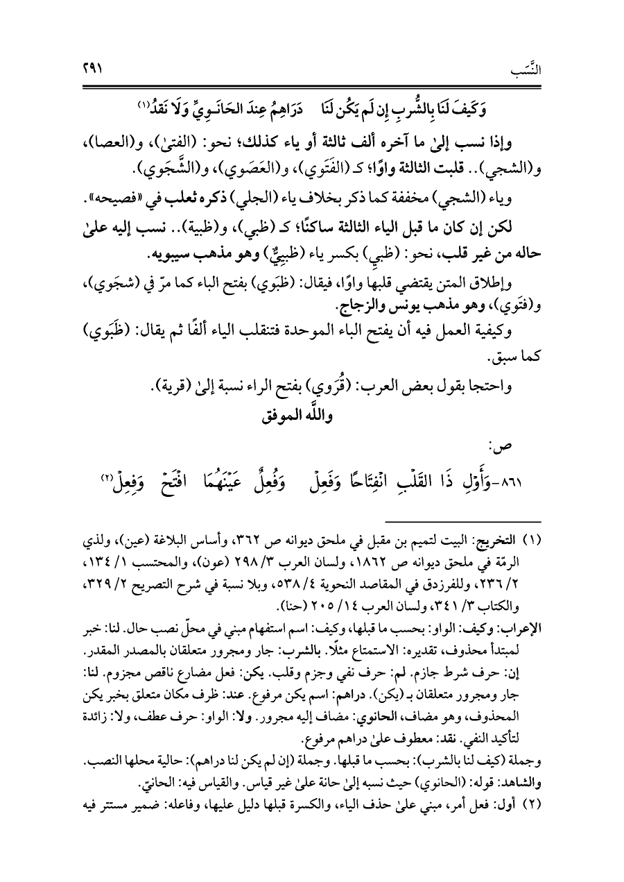 الإِعراب: وكيف: الواو: بحسب ما قبلها، وكيف: اسم استفهام مبني فِي محلّ نصب حال. لنا: خبر لمبتدأ محذوف، تقديره: الاستمتاع مثلًا. بالشرب: جار ومجرور متعلقان بالمصدر المقدر. إِن: حرف شرط جازم. لم: حرف نفي وجزم وقلب. يكن: فعل مضارع ناقص مجزوم. لنا: جار ومجرور متعلقان بـ (يكن). درهم: اسم يكن مرفوع. عند: ظرف مكان متعلق بخبر يكن المحذوف، وهو مضاف، الحانوي: مضاف إِليه مجرور. ولا: الواو: حرف عطف، ولا: زائدة لتأكيد النفي. نقد: معطوف على دراهم مرفوع.
