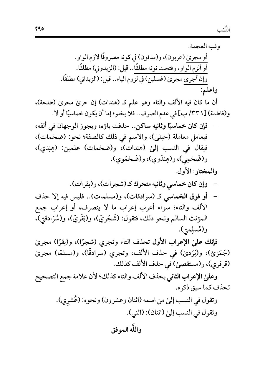 - فإن كان خماسيًا وثانيه سان. . حذفت ياؤه، ويجوز الوجهان فِي ألفه، فيعامل معاملة (حبلى)، والاسم فِي ذلك كالصفة؛ نحو: (ضخمات)، فيقال فِي النسب إلى (هندات)، و (ضخمات) علمين: (هِنِدي)، و (ضَخمِي)، و (هِندَوي)، و (ضَخمَوي).