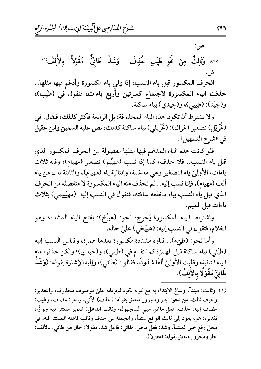 وأما نحو: (طيّء). . فياؤه مشددة مكسورة بعدها همزة، وقياس النسب إليه (طيْئي) بياء ساكنة قبل الهمزة كما تقدم فِي (طيبي)، و (حيدي)؛ ولكن حذفوا ميه الياء الثانية، وقلبت الأولى ألفًا شذوذًا، فقالوا: (طائي)، وإليه الإشارة بقوله: (وَشَذَّ طَائِيٌّ مَقُوْلًا بِالأَلِفْ).