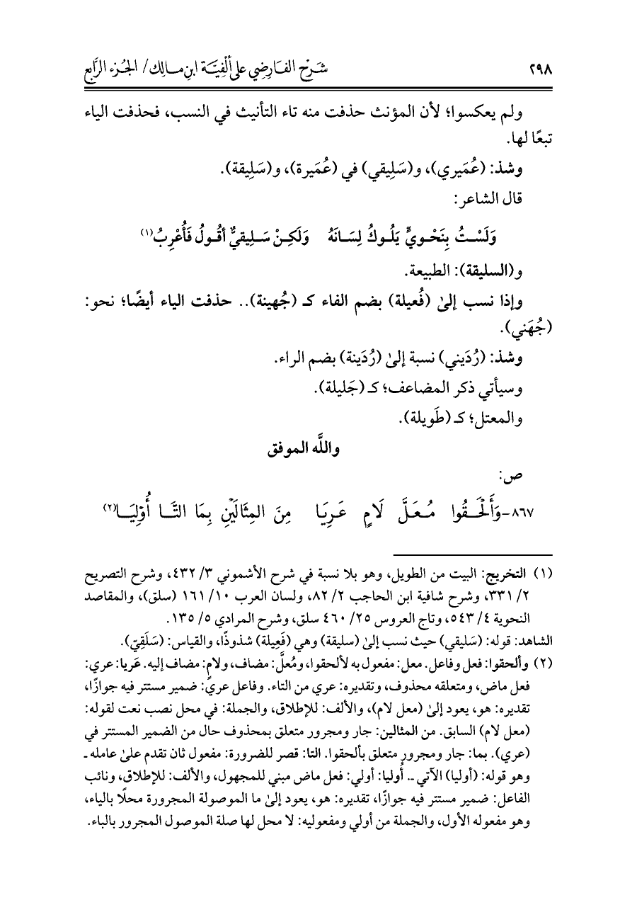 الشاهد: قوله: (سَليقي) حيث نسب إلى (سليقة) وهي (فَعِيلة) شذوذًا، والقياس: (سَلَقِيّ).