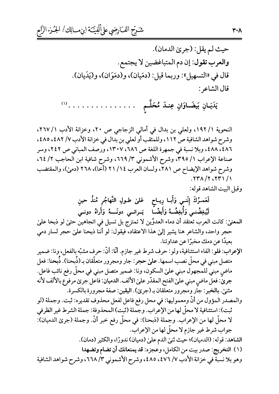 الشاهد: قوله: (الدميان)؛ حيث ثنى الدم على (دميان) ندورًا، والكثير (دمان).