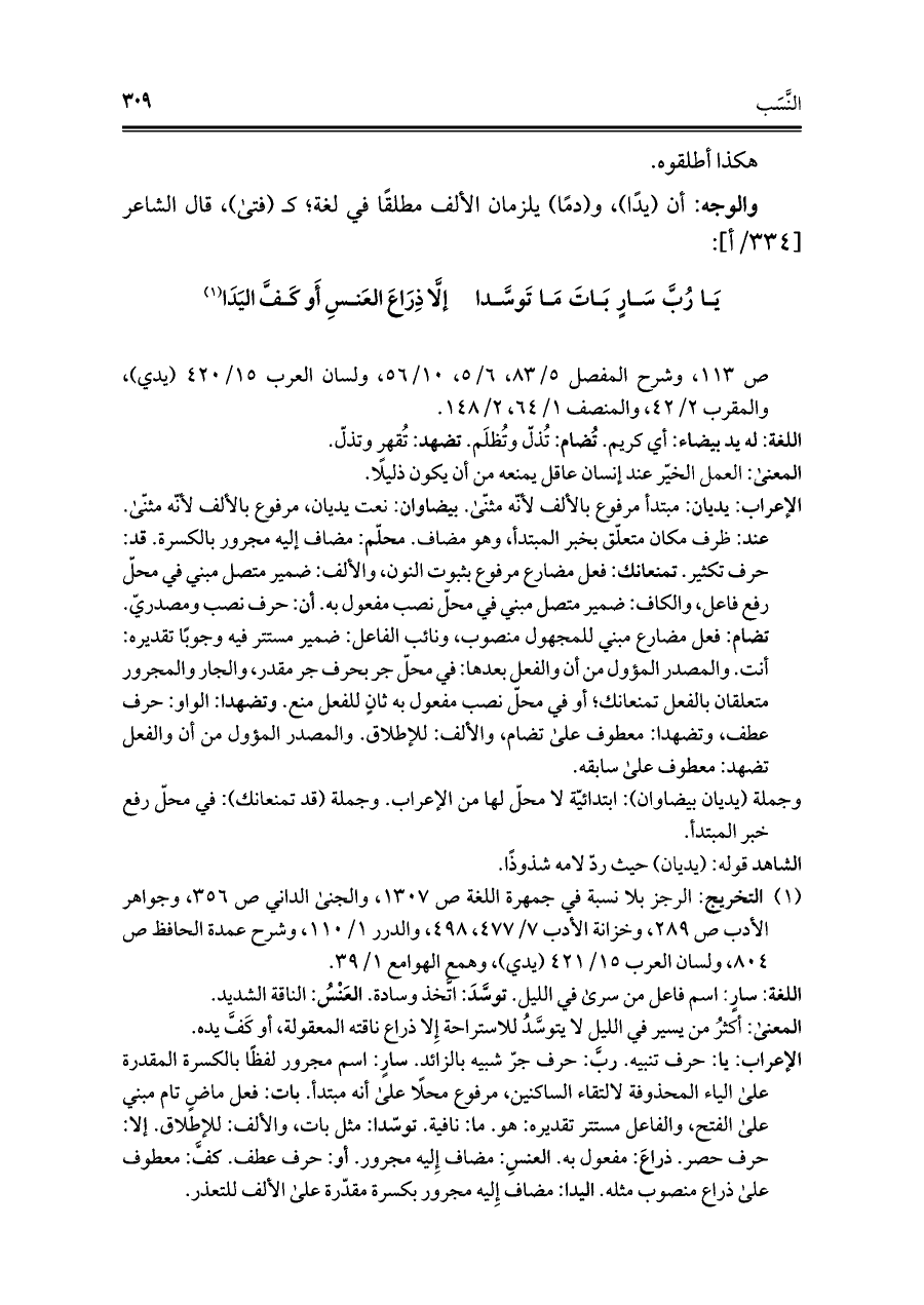 الإعراب: يا: حرف تنبيه. ربَّ: حرف جر شبيه بالزائد. سارٍ: اسم مجرور لفظًا بالكسرة المقدرة على الياء المحذوفة لالتقاء الساكنين، مرفوع محلًا على أنه مبتدأ. بات: فعل ماضٍ تام مبني على الفتح، والفاعل مستتر تقديره: هو. ما: نافية. توسّدا: مثل بات، والألف: للإطلاق. إلا: حرف حصر. ذراعَ: مفعول به. العنسِ: مضاف إِليه مجرور. أو: حرف عطف. كفَّ: معطوف على ذراع منصوب مثله. اليدا: مضاف إِليه مجرور بكسرة مقدّرة على الألف للتعذر.