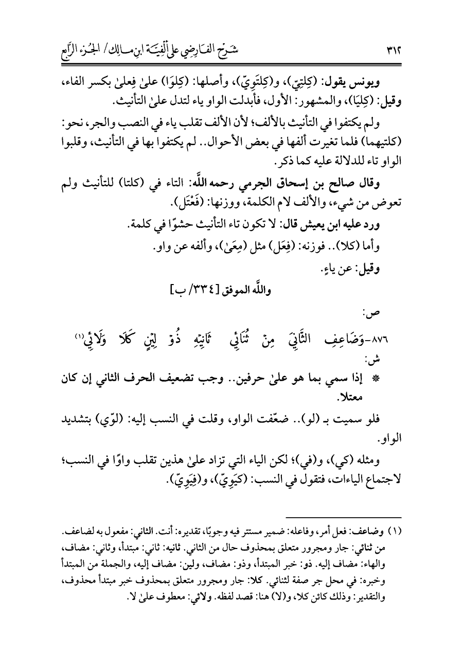 ويونس يقول: (كِلتِيّ)، و (كِلتَوِيّ)، وأصلها: (كِلوَا) على فِعلى بكسر الفاء، وقيل: (كِليَا)، والمشهور: الأول، فأبدلت الواو ياء لتدل على التأنيث.