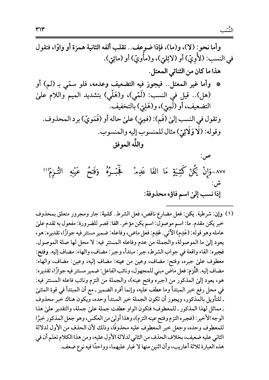 (¬١) وإن: شرطية. يكن: فعل مضارع ناقص، فعل الشرط. كشية: جار ومجرور متعلق بمحذوف خبر يكن مقدم. ما: اسم موصول: اسم يكن مؤخر. الفا: قصر للضرورة: مفعول به تقدم على عامله وهو قوله: (عَدِم) الآتي. عَدِم: فعل ماض، وفاعله: ضمير مستتر فيه جوازًا، تقديره: هو، يعود إلى ما الموصولة، والجملة من عدم وفاعله المستتر فيه: لا محل لها صلة الموصول. فجبره: الفاء واقعة في جواب الشرط، جبر: مبتدأ، وجبر: مضاف، والهاء: مضاف إليه. وفتح: معطوف على جبره، وفتح: مضاف، وعين من عينه: مضاف إليه، وعين: مضاف، والهاء: مضاف إليه. التُزم: فعل ماض مبني للمجهول، ونائب الفاعل: ضمير مستتر فيه جوازًا، تقديره: هو، يعود إلى المذكور من (جبره وفتح عينه)، والجملة من التزم ونائب فاعله المستتر فيه: في محل رفع خبر المبتدأ وما عطف عليه، وإنما أفرد الضمير -مع أن المبتدأ في قوة المثنى- للتأويل بالمذكور، ويجوز أن تكون الجملة خبر المبتدأ وحده، ويكون هناك خبر محذوف -مماثل لهذا المذكور- للمعطوف؛ فتكون الواو عطفت جملة على جملة، والتقدير على هذا الوجه الأخير: (فجبره التزم وفتح عينه التزم)، وهذا أولى من العكس، وهو جعل المذكور خبرًا للمعطوف وحده، وجعل خبر المعطوف عليه محذوفًا، وذلك لأن الحذف من الأول لدلالة الثاني عليه ضعيف، بخلاف الحذف من الثاني لدلالة الأول عليه، ومن هذا الكلام تعلم أن في هذه العبارة ثلاثة أعاريب، وأن اثنين منها لا غبار عليهما، وواحدًا فيه نوع ضعف.