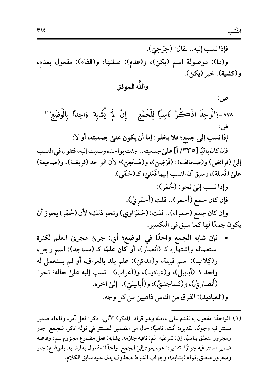 ٨٧٨ - وَالْوَاحِدَ اذْكُرْ نَاسِبًا لِلْجَمْعِ ... إِنْ لَمْ يُشَابِهْ وَاحِدًا بِالْوَضْعِ (¬١)