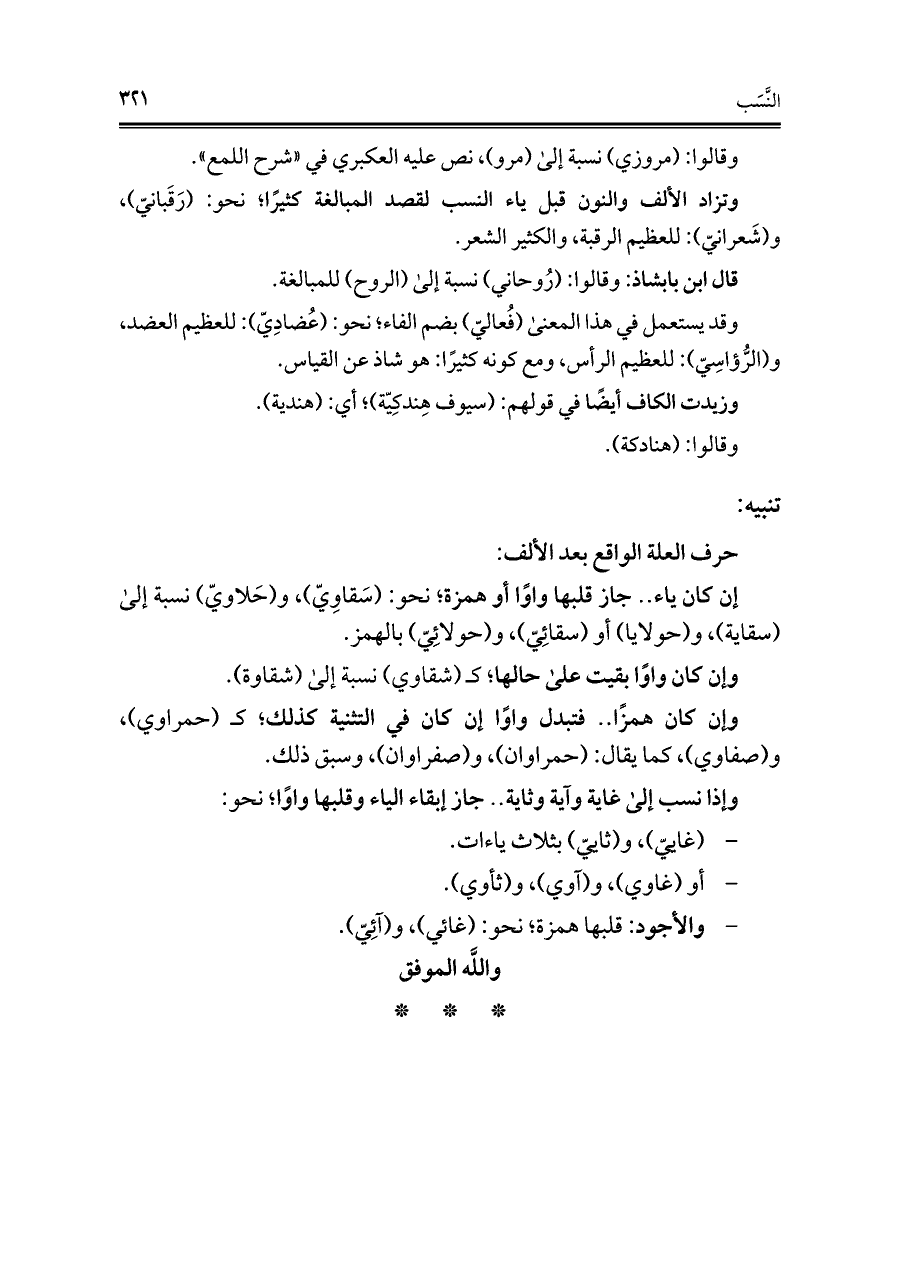 وتزاد الألف والنون قبل ياء النسب لقصد المبالغة كثيرًا؛ نحو: (رَقَبانيّ)، و (شَعرانيّ): للعظيم الرقبة، والكثير الشعر.