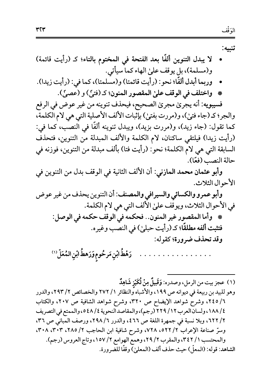 وأبو عمرو والكسائي والسيرافي والمصنف: أن التنوين يحذف من غير عوض في الأحوال الثلاث، ويوقف على الألف التي هي لام الكلمة.