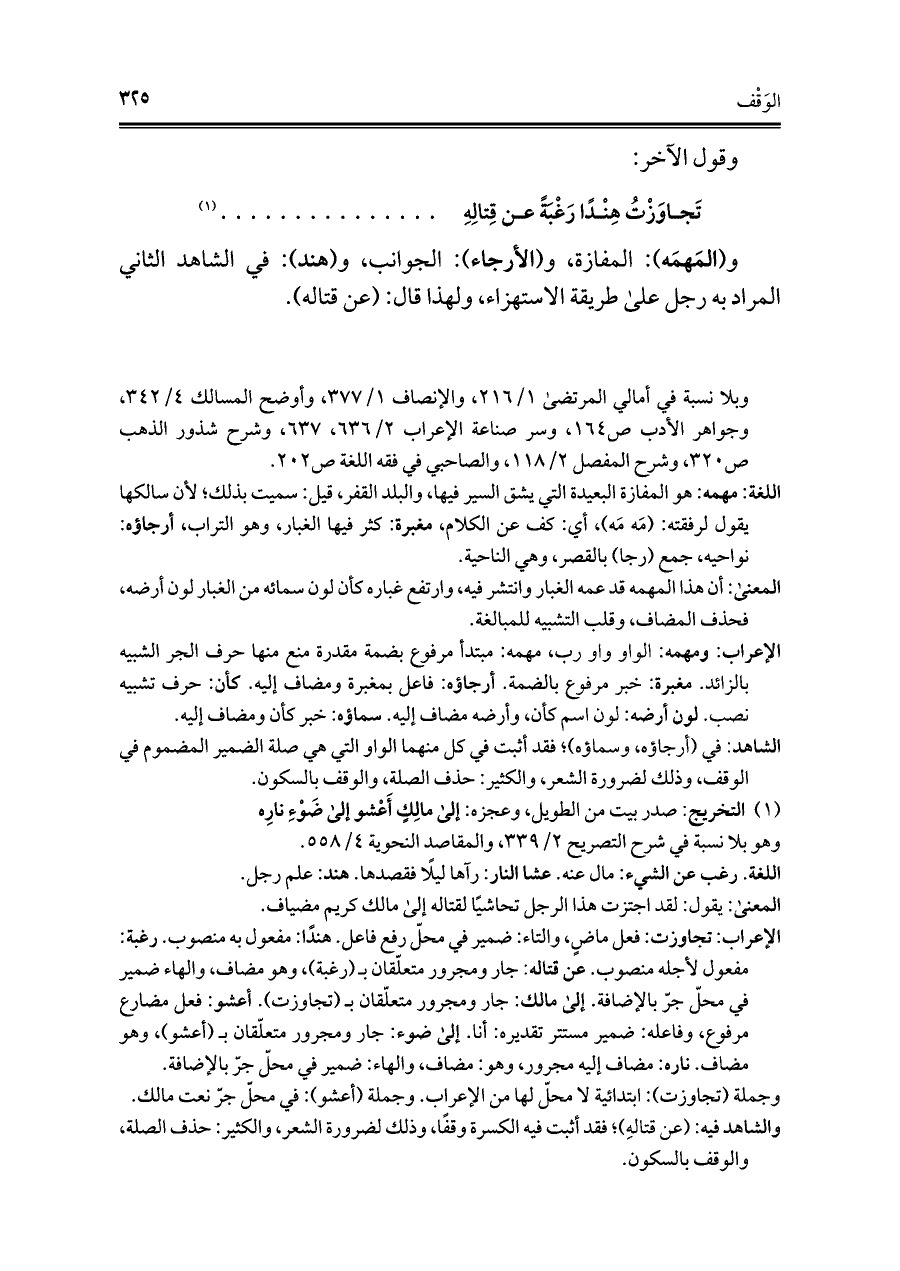الإعراب: تجاوزت: فعل ماضٍ، والتاء: ضمير في محل رفع فاعل. هندًا: مفعول به منصوب. رغبة: مفعول لأجله منصوب. عن قتاله: جار ومجرور متعلّقان بـ (رغبة)، وهو مضاف، والهاء ضمير في محلّ جرّ بالإضافة. إلى مالك: جار ومجرور متعلّقان بـ (تجاوزت). أعشو: فعل مضارع مرفوع، وفاعله: ضمير مستتر تقديره: أنا. إلى ضوء: جار ومجرور متعلّقان بـ (أعشو)، وهو مضاف. ناره: مضاف إليه مجرور، وهو: مضاف، والهاء: ضمير في محلّ جرّ بالإضافة.