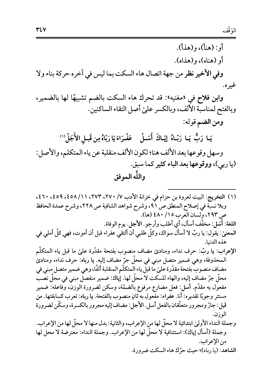 الإعراب: يا ربّ: حرف نداء، ومنادى مضاف منصوب بفتحة مقدّرة على ما قبل ياء المتكلّم المحذوفة، وهي ضمير متصل مبني في محل جر مضاف إليه. يا رباه: حرف نداء، ومنادى مضاف منصوب بفتحة مقدّرة على ما قبل ياء المتكلّم المنقلبة ألفًا، وهي ضمير متصل مبني في محلّ جرّ مضاف إليه، والهاء للسكت لا محلّ لها. إياك: ضمير منفصل مبني في محلّ نصب مفعول به مقدّم. أسل: فعل مضارع مرفوع بالضمّة، وسكن لضرورة الوزن، وفاعله: ضمير مستتر وجوبًا تقديره: أنا. عفراء: مفعول به ثانِ منصوب بالفتحة. يا رباه: تعرب كسابقتها. من قبل: جارّ ومجرور متعلّقان بالفعل أسل. الأجل: مضاف إليه مجرور بالكسرة، وسكّن لضرورة الوزن.