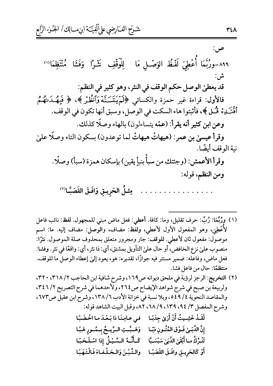 ٨٩٩ - ورُبَّمَا أُعْطِيَ لَفْظُ الوَصْلِ مَا ... لِلْوَقْفِ نَثْرًا وَفَشَا مُنْتَظِمَا (¬١)
