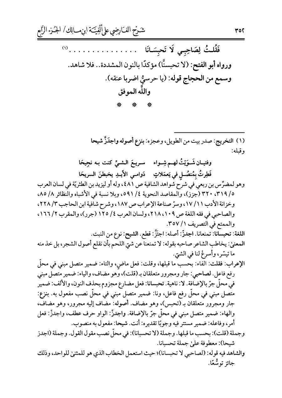 الإعراب: فقلت: الفاء: بحسب ما قبلها، وقلت: فعل ماضٍ، والتاء: ضمير متصل مبني في محلّ رفع فاعل. لصاحبي: جار ومجرور متعلقان بـ (قلت)، وهو مضاف، والياء: ضمير متصل مبني في محلّ جرّ بالإضافة. لا: ناهية. تحبسانا: فعل مضارع مجزوم بحذف النون، والألف: ضمير متصل مبني في محلّ رفع فاعل، ونا: ضمير متصل مبني في محلّ نصب مفعول به. ينزع: جار ومجرور متعلقان بـ (تحبس)، وهو مضاف. أصوله: مضاف إليه مجرور، وهو مضاف، والهاء: ضمير متصل مبني في محلّ جرّ بالإضافة. واجدزّ: الواو حرف عطف، واجدزّ: فعل أمر، وفاعله: ضمير مستتر فيه وجوبًا تقديره: أنت. شيحا: مفعول به منصوب.