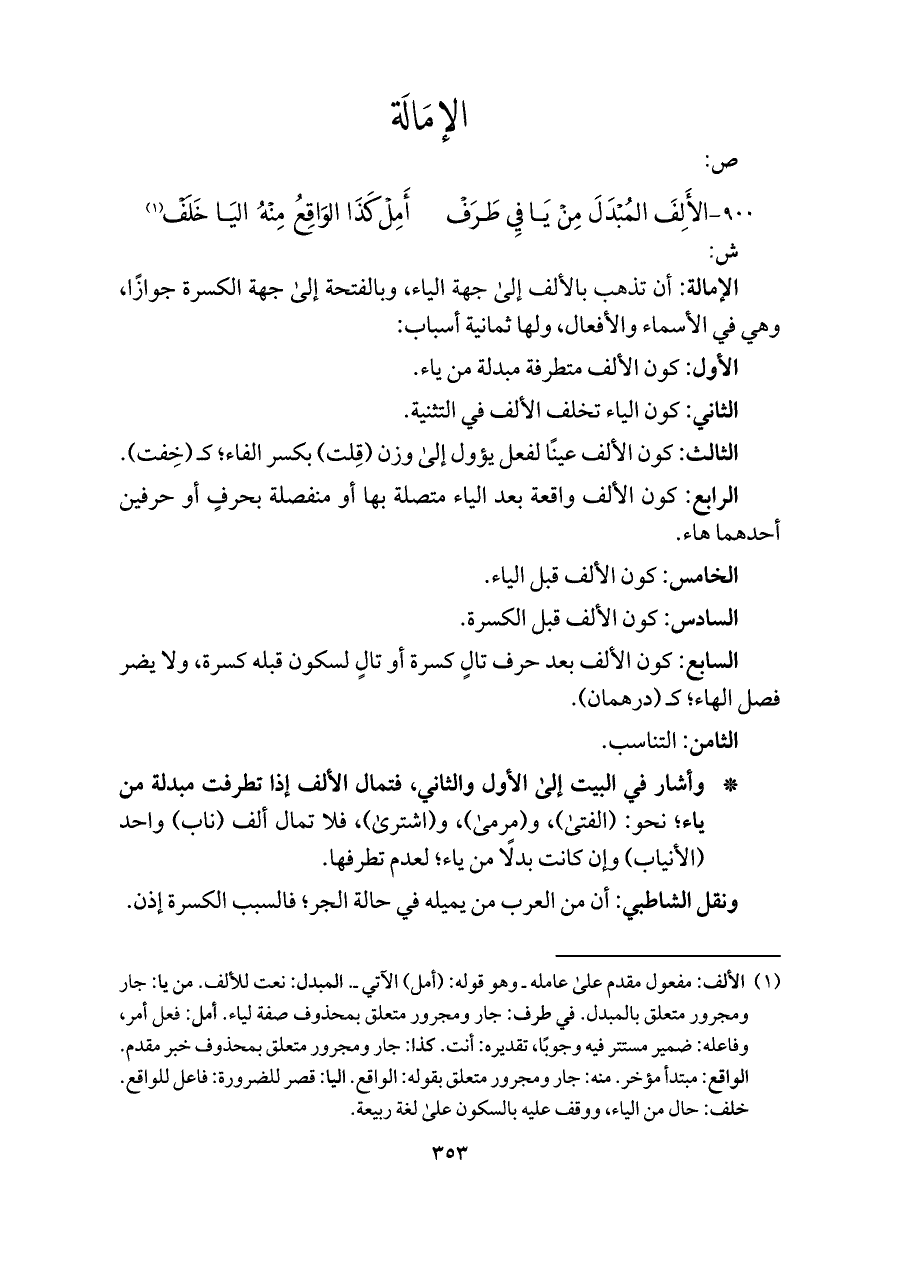 الإمالة: أن تذهب بالألف إلى جهة الياء، وبالفتحة إلى جهة الكسرة جوازًا، وهي في الأسماء والأفعال، ولها ثمانية أسباب: