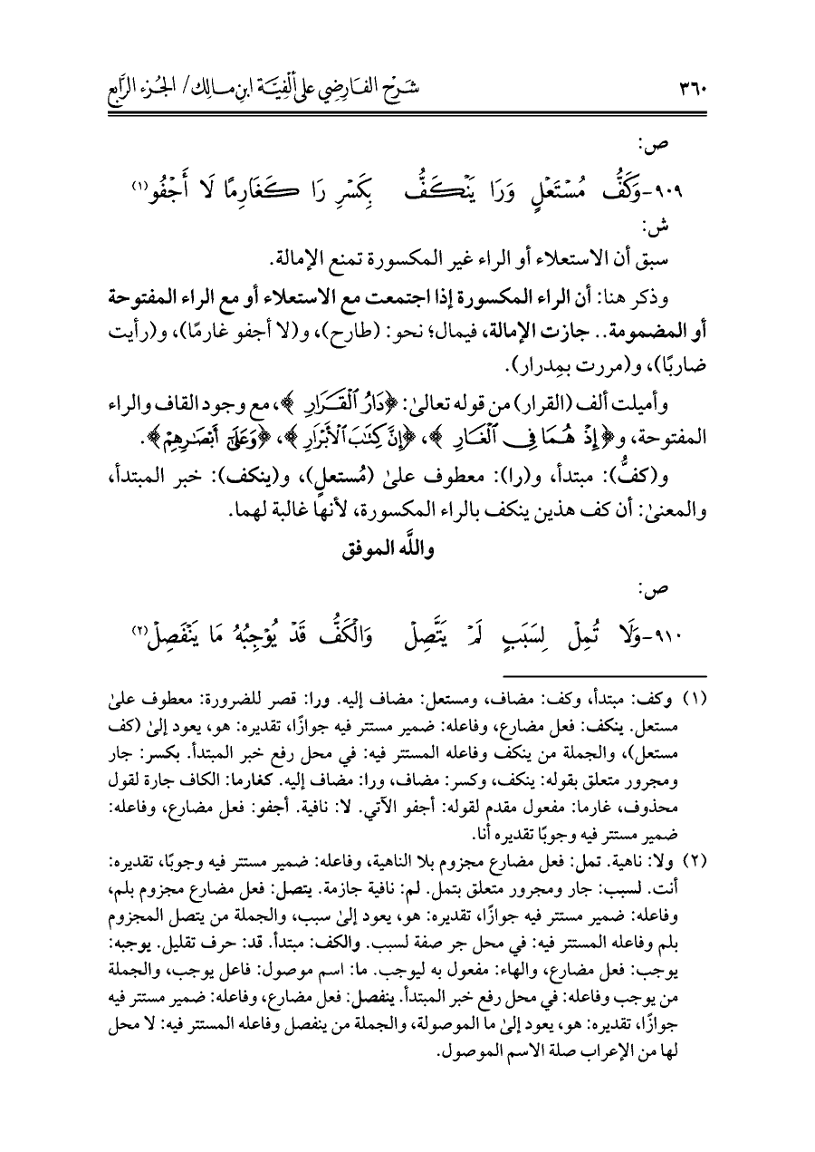 (¬١) وكف: مبتدأ، وكف: مضاف، ومستعل: مضاف إليه. ورا: قصر للضرورة: معطوف على مستعل. ينكف: فعل مضارع، وفاعله: ضمير مستتر فيه جوازًا، تقديره: هو، يعود إلى (كف مستعل)، والجملة من ينكف وفاعله المستتر فيه: في محل رفع خبر المبتدأ. بكسر: جار ومجرور متعلق بقوله: ينكف، وكسر: مضاف، ورا: مضاف إليه. كغارما: الكاف جارة لقول محذوف، غارما: مفعول مقدم لقوله: أجفو الآتي. لا: نافية. أجفو: فعل مضارع، وفاعله: ضمير مستتر فيه وجوبًا تقديره أنا.