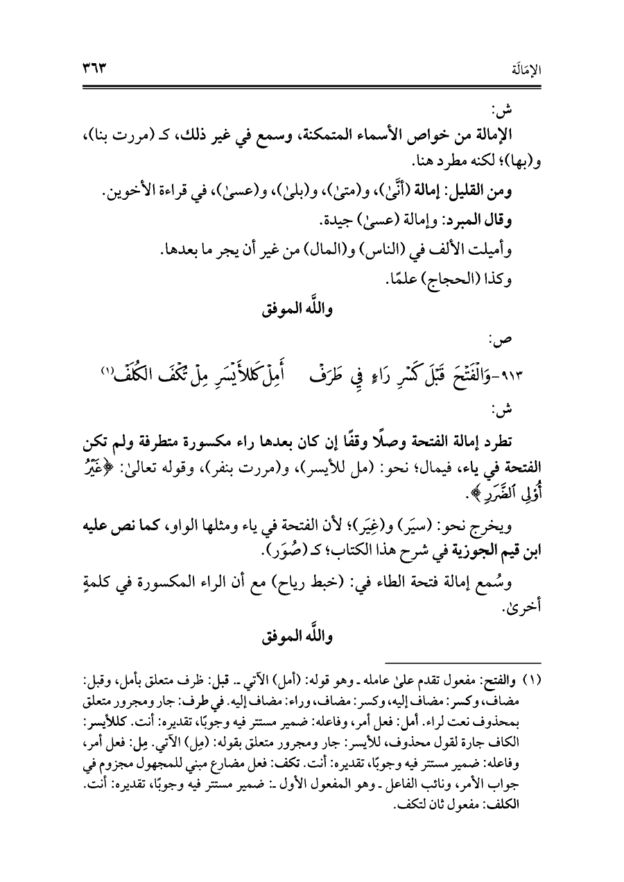 (¬١) والفتح: مفعول تقدم على عامله -وهو قوله: (أمل) الآتي-. قبل: ظرف متعلق بأمل، وقبل: مضاف، وكسر: مضاف إليه، وكسر: مضاف، وراء: مضاف إليه. في طرف: جار ومجرور متعلق بمحذوف نعت لراء. أمل: فعل أمر، وفاعله: ضمير مستتر فيه وجوبًا، تقديره: أنت. كللأيسر: الكاف جارة لقول محذوف، للأيسر: جار ومجرور متعلق بقوله: (مِل) الآتي. مِل: فعل أمر، وفاعله: ضمير مستتر فيه وجوبًا، تقديره: أنت. تكف: فعل مضارع مبني للمجهول مجزوم في جواب الأمر، ونائب الفاعل -وهو المفعول الأول-: ضمير مستتر فيه وجوبًا، تقديره: أنت. الكلف: مفعول ثان لتكف.