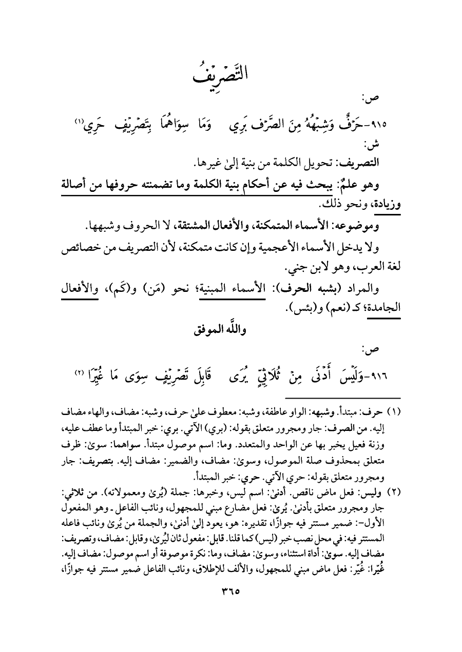 (¬١) حرف: مبتدأ. وشبهه: الواو عاطفة، وشبه: معطوف على حرف، وشبه: مضاف، والهاء مضاف إليه. من الصرف. جار ومجرور متعلق بقوله: (بري) الآتي. بري: خبر المبتدأ وما عطف عليه، وزنة فعيل يخبر بها عن الواحد والمتعدد. وما: اسم موصول مبتدأ. سواهما: سوى: ظرف متعلق بمحذوف صلة الموصول، وسوى: مضاف، والضمير: مضاف إليه. بتصريف: جار ومجرور متعلق بقوله: حري الآتي. حرى: خبر المبتدأ.