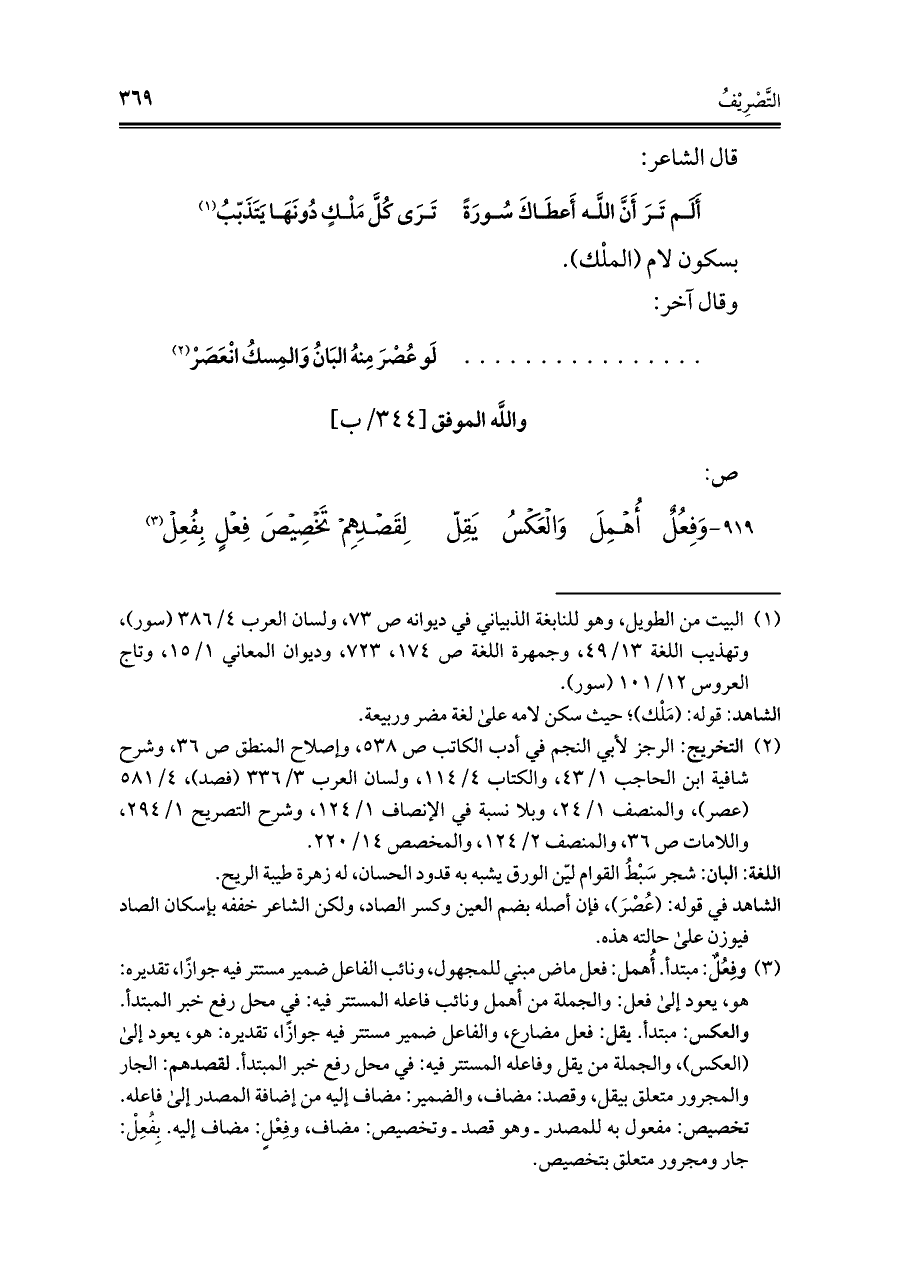 (¬٣) وفِعُلٌ: مبتدأ. أُهمل: فعل ماض مبني للمجهول، ونائب الفاعل ضمير مستتر فيه جوازًا، تقديره: هو، يعود إلى فعل: والجملة من أهمل ونائب فاعله المستتر فيه: في محل رفع خبر المبتدأ. والعكس: مبتدأ. يقل: فعل مضارع، والفاعل ضمير مستتر فيه جوازًا، تقديره: هو، يعود إلى (العكس)، والجملة من يقل وفاعله المستتر فيه: في محل رفع خبر المبتدأ. لقصدهم: الجار والمجرور متعلق بيقل، وقصد: مضاف، والضمير: مضاف إليه من إضافة المصدر إلى فاعله. تخصيص: مفعول به للمصدر -وهو قصد- وتخصيص: مضاف، وفِعْلٍ: مضاف إليه. بِفُعِلْ: جار ومجرور متعلق بتخصيص.