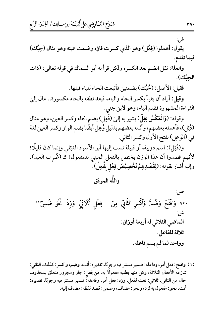 يقول: أهملوا (فِعُل) وهو الذي كسرت فاؤه وضمت عينه وهو مثال (حِبُك) فيما تقدم.