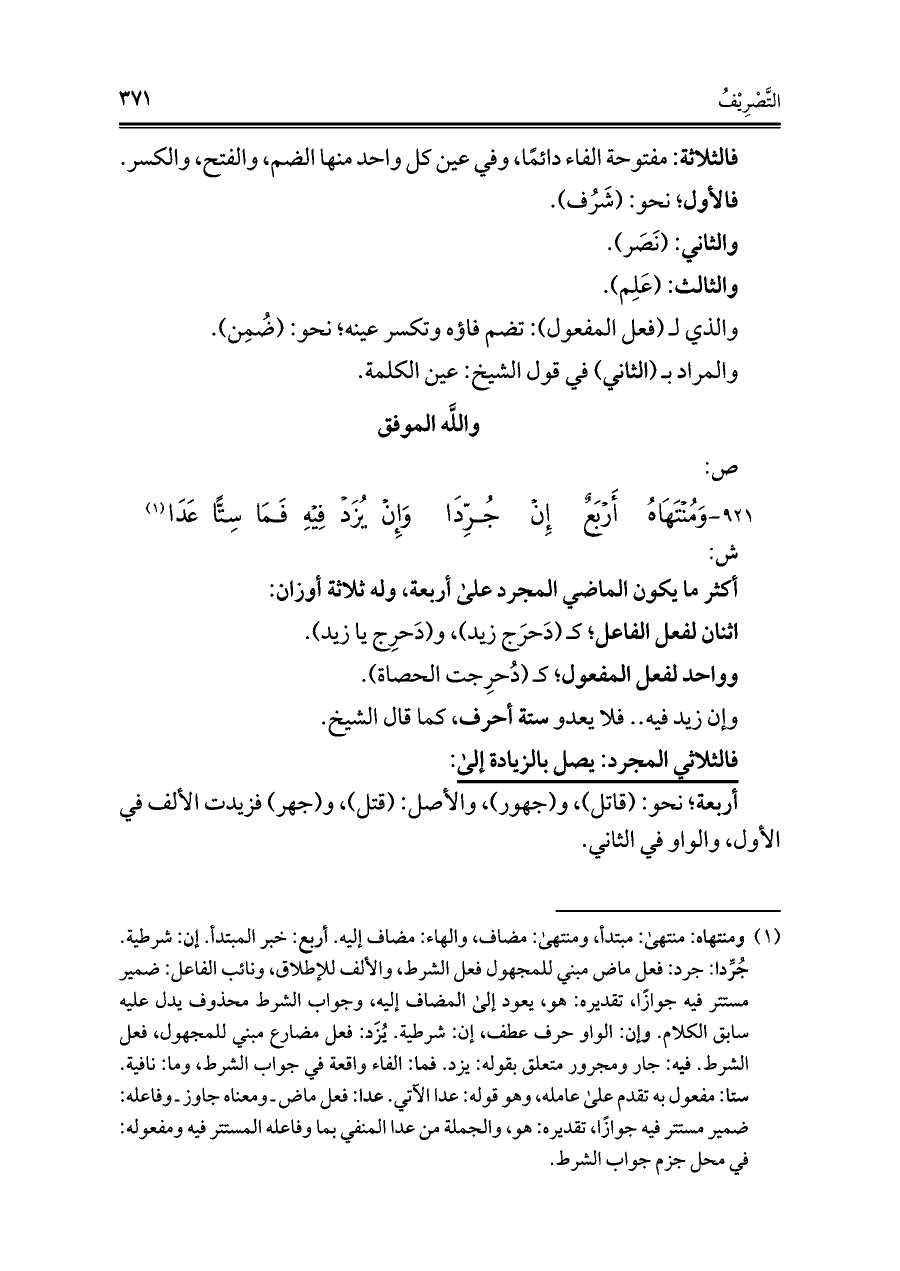 (¬١) ومنتهاه: منتهى: مبتدأ، ومنتهى: مضاف، والهاء: مضاف إليه. أربع: خبر المبتدأ. إن: شرطية. جُرِّدا: جرد: فعل ماض مبني للمجهول فعل الشرط، والألف للإطلاق، ونائب الفاعل: ضمير مستتر فيه جوازًا، تقديره: هو، يعود إلى المضاف إليه، وجواب الشرط محذوف يدل عليه سابق الكلام. وإن: الواو حرف عطف، إن: شرطية. يُزَد: فعل مضارع مبني للمجهول، فعل الشرط. فيه: جار ومجرور متعلق بقوله: يزد. فما: الفاء واقعة في جواب الشرط، وما: نافية. ستا: مفعول به تقدم على عامله، وهو قوله: عدا الآتي. عدا: فعل ماض -ومعناه جاوز- وفاعله: ضمير مستتر فيه جوازًا، تقديره: هو، والجملة من عدا المنفي بما وفاعله المستتر فيه ومفعوله: في محل جزم جواب الشرط.