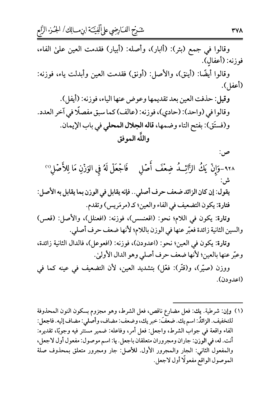 ٩٢٨ - وَإِنْ يَكُ الزَّائِدُ ضِعْفَ أَصْلِ ... فَاجْعَلْ لَهُ فِي الوَزْنِ مَا لِلأَصْلِ (¬١)