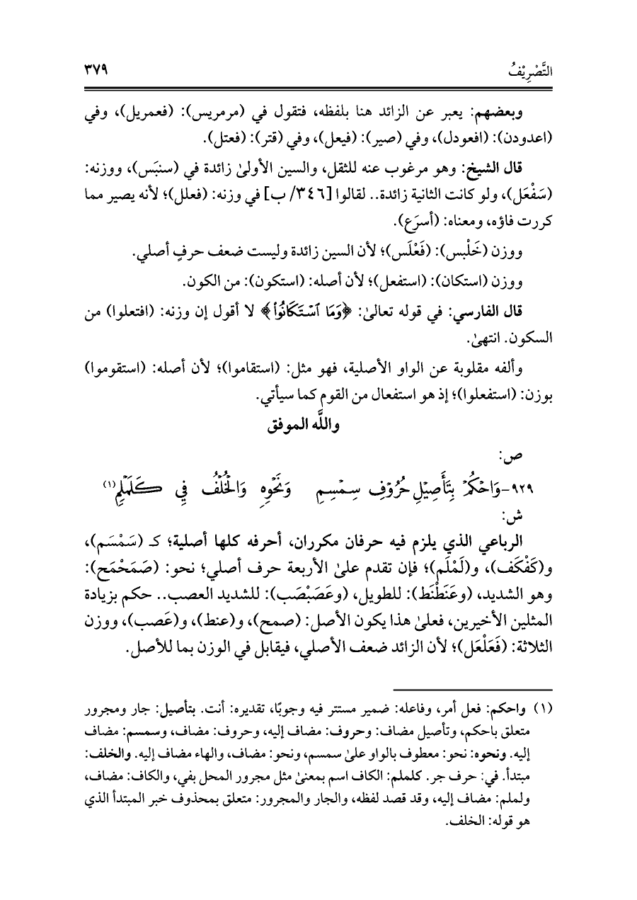وبعضهم: يعبر عن الزائد هنا بلفظه، فتقول في (مرمريس): (فعمريل)، وفي (اعدودن): (افعودل)، وفي (صير): (فيعل)، وفي (قتر): (فعتل).