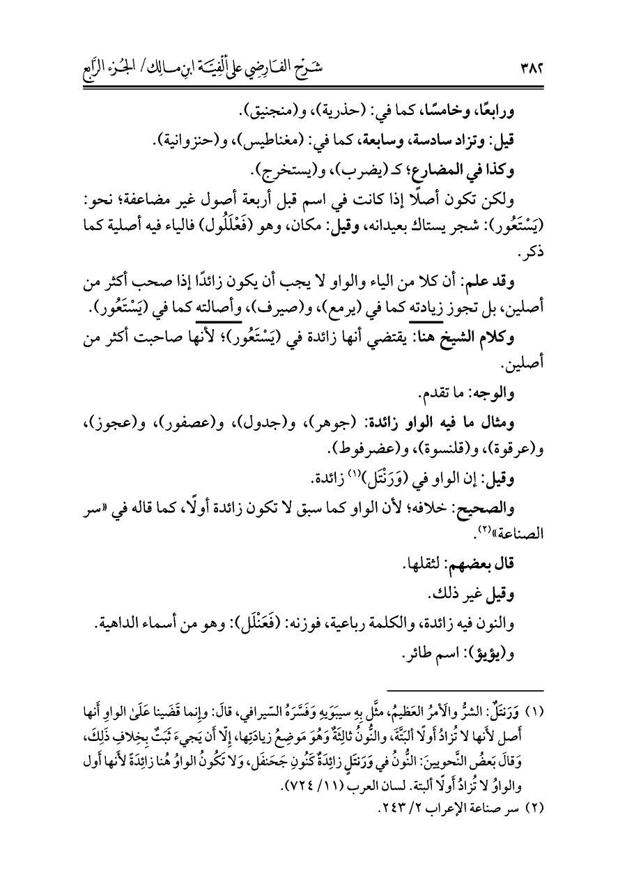 وقد علم: أن كلا من الياء والواو لا يجب أن يكون زائدًا إذا صحب أكثر من أصلين، بل تجوز زيادته كما في (يرمع)، و (صيرف)، وأصالته كما في (يَسْتَعُور).