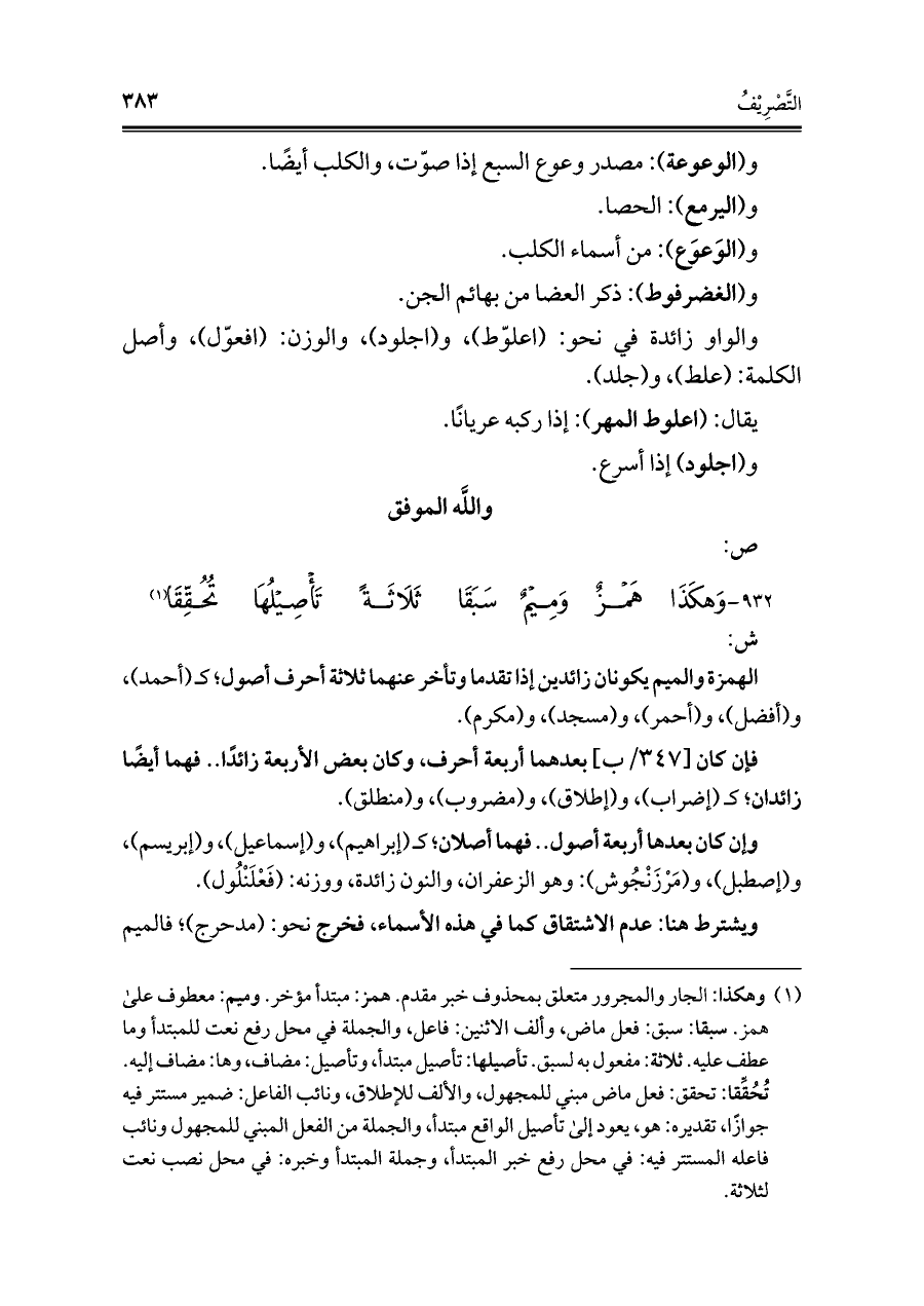 (¬١) وهكذا: الجار والمجرور متعلق بمحذوف خبر مقدم. همز: مبتدأ مؤخر. وميم: معطوف على همز سبقا: سبق: فعل ماض، وألف الاثنين: فاعل، والجملة في محل رفع نعت للمبتدأ وما عطف عليه. ثلاثة: مفعول به لسبق. تأصيلها: تأصيل مبتدأ، وتأصيل: مضاف، وها: مضاف إليه. تُحُقِّقا: تحقق: فعل ماض مبني للمجهول، والألف للإطلاق، ونائب الفاعل: ضمير مستتر فيه جوازًا، تقديره: هو، يعود إلى تأصيل الواقع مبتدأ، والجملة من الفعل المبني للمجهول ونائب فاعله المستتر فيه: في محل رفع خبر المبتدأ، وجملة المبتدأ وخبره: في محل نصب نعت لثلاثة.