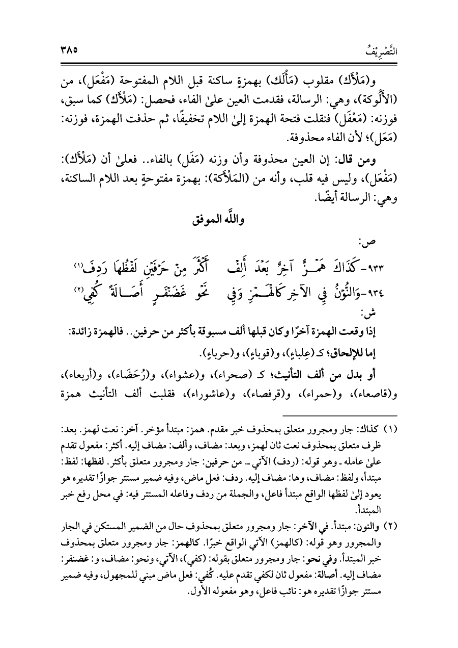 (¬٢) والنون: مبتدأ. في الآخر: جار ومجرور متعلق بمحذوف حال من الضمير المستكن في الجار والمجرور وهو قوله: (كالهمز) الآتي الواقع خبرًا. كالهمز: جار ومجرور متعلق بمحذوف خبر المبتدأ. وفي نحو: جار ومجرور متعلق بقوله: (كفي)، الآتي، ونحو: مضاف، و: غضنفر: مضاف إليه. أصالة: مفعول ثان لكفي تقدم عليه. كُفي: فعل ماض مبني للمجهول، وفيه ضمير مستتر جوازًا تقديره هو: نائب فاعل، وهو مفعوله الأول.